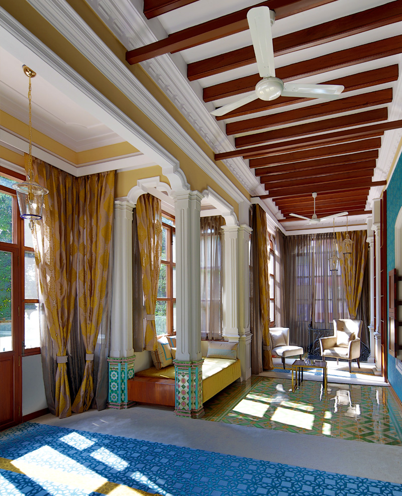 The intervention was responsive to the heritage and respected the existing building typology with an edge of modernism. A design story was woven around the space taking inspiration from the existing patterns in the house, from finials in the façade to motifs in the flooring around the house. Hand-woven rugs, handmade woolen carpets, customized furniture and imported hand blown glass chandeliers adorning this enchanting residence are only a few of the elements that make this home fit for royalty